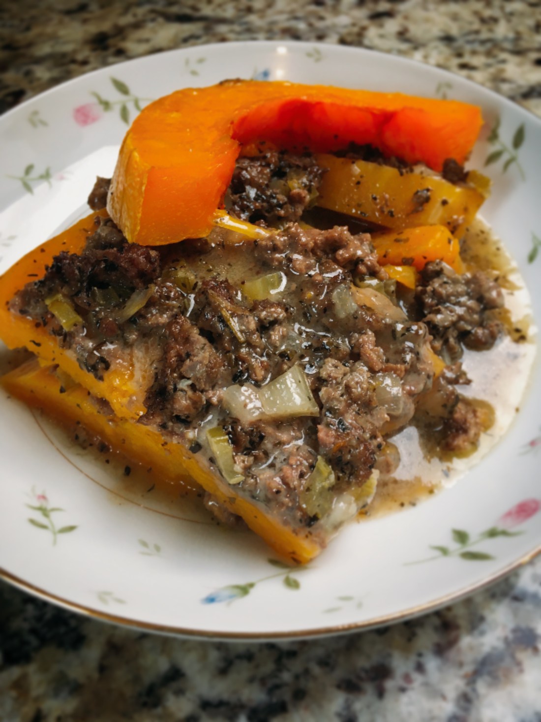 In a 9 x 11 casserole pan, begin by covering the bottom of the pan with squash. Sprinkle with a pinch of sea salt. Next, spoon half of the meat sauce over. Add another layer of butternut squash, sprinkle with a pinch of sea salt. Add the rest of the meat sauce. Top with whatever remaining pieces of squash that you have left making it look as pretty as you prefer.