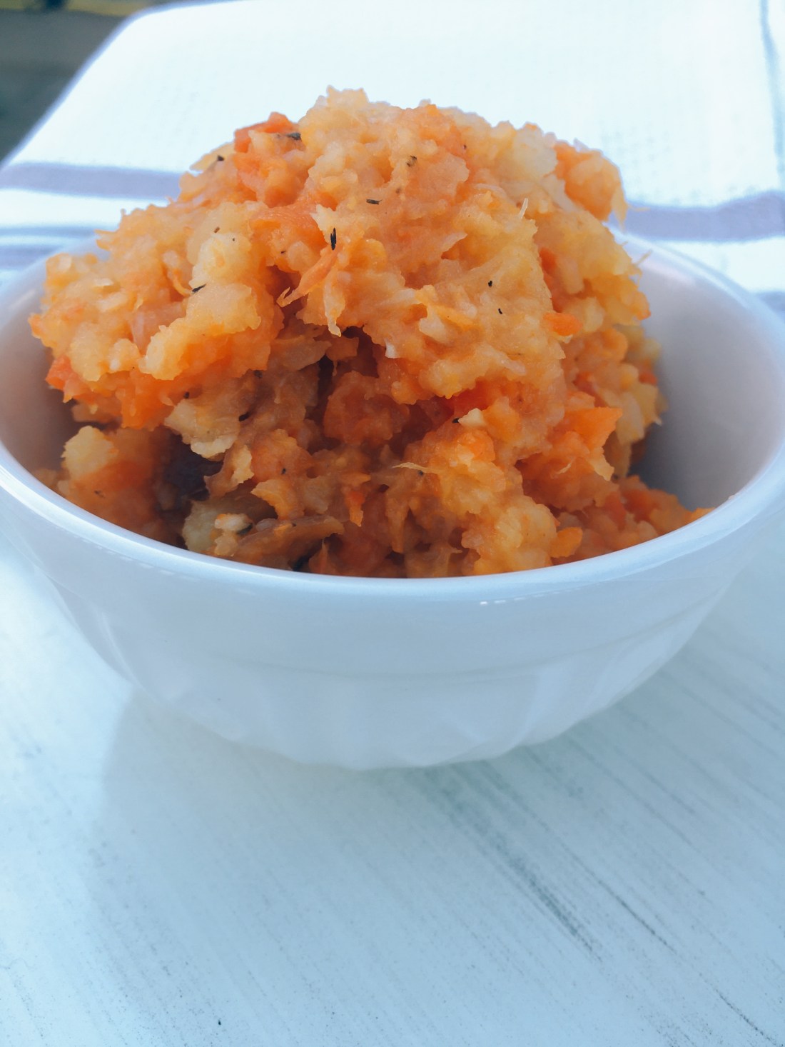 Prepare vegetables by cubing them into similar size pieces. Place in a large sauce pan and cover with water. Add 1 tsp. sea salt. Bring to a boil and let cook for 10-15 minutes until all vegetables are soft. Gently pierce with a knife, to determine doneness, but these should be on the softer side because you will be mashing with a potato masher by hand.